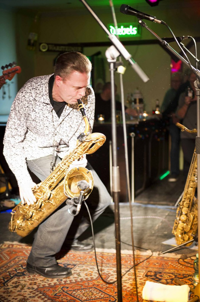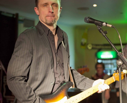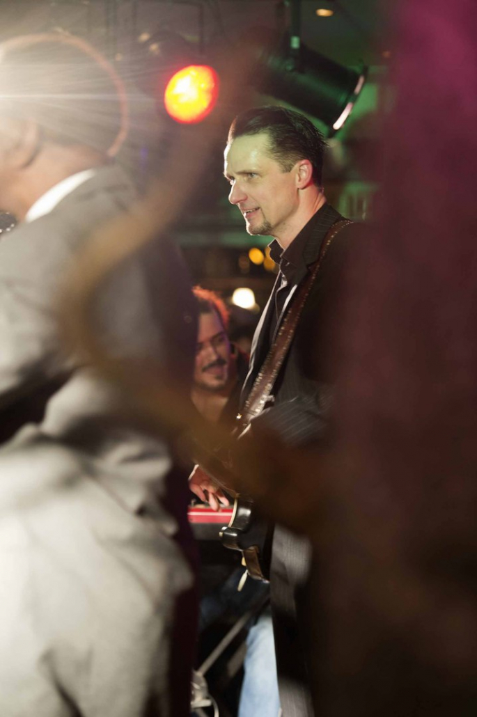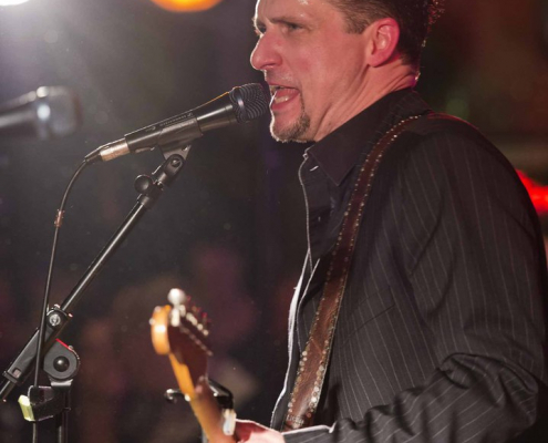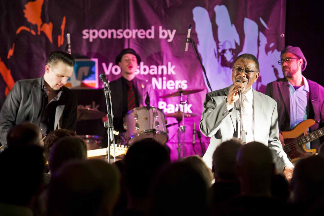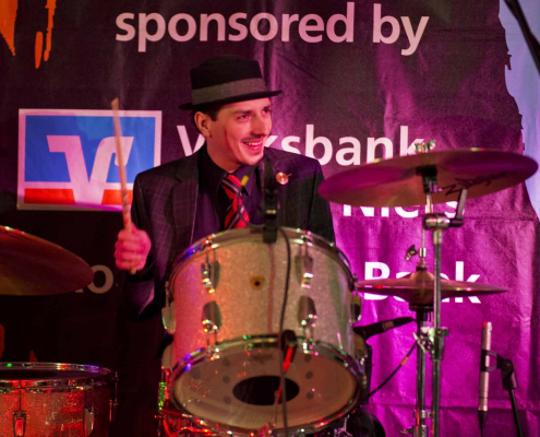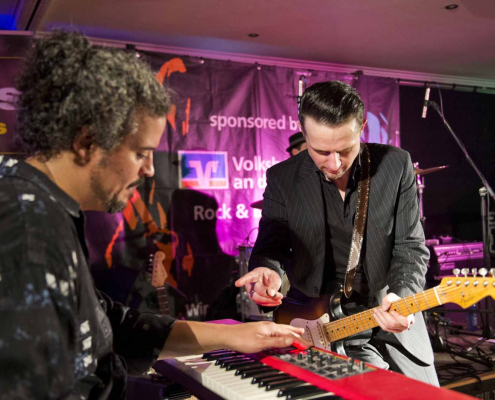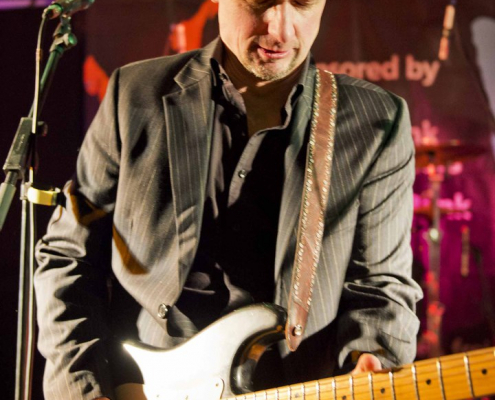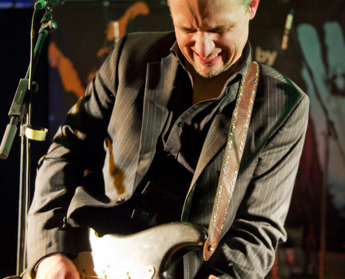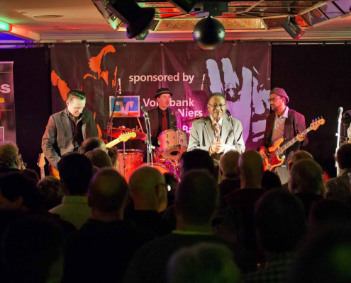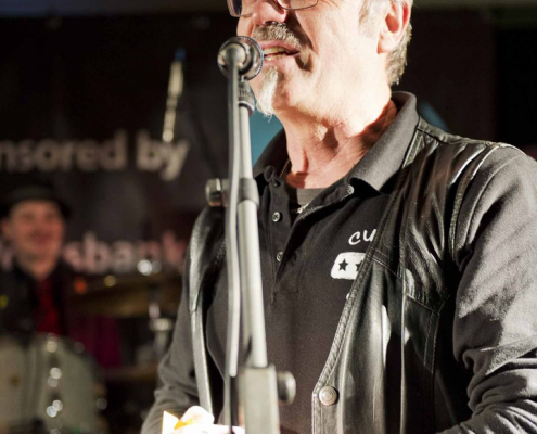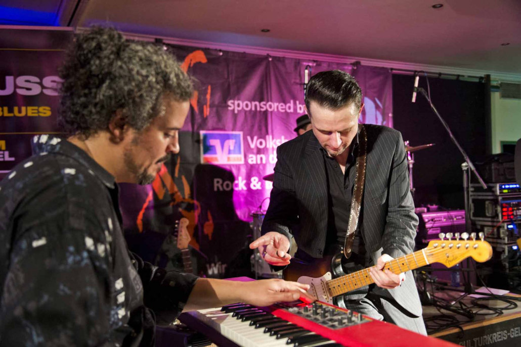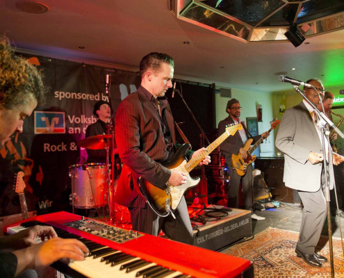 Nicht nur Kai Strauss an der Fender-Gitarre beeindruckte das wiederum sehr zahlreich erschienene Publikum im Muddy Waters Saal mit seiner authentischen Interpretation des Chicago – Blues, sondern auch seine vier bzw. fünf Mitstreiter. In den Phasen ohne Tommie Harris übernahm Kai Strauss auch die Gesangsparts, wenn Tommie Harris auf der Bühne war und sang, beschränkte er sich auf sein virtuoses Blues – Gitarrenspiel. Nicht minder virtuos erwies sich sein kongenialer Mitstreiter Thomas Feldmann, der gleich 3 Blasinstrumente genial bediente : Tenorsaxofon, Baritonsaxofon und Mundharmonika. Mit beeindruckenden Soli überzeugte auch Mo Fuhrhop das Gelderner Bluespublikum, der aus seiner “Nord Electro” nicht nur Hammond-, sondern auch Wurlitzer- und e-piano Sounds hervor zauberte.