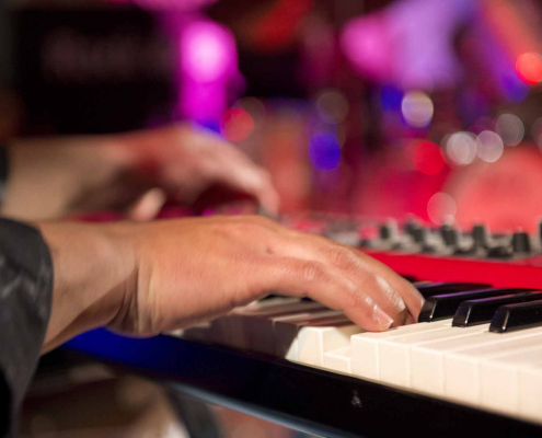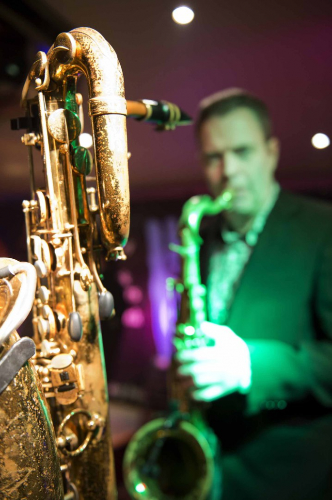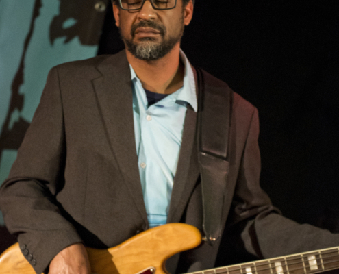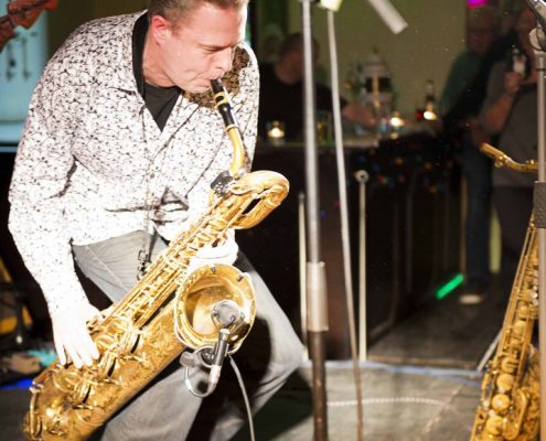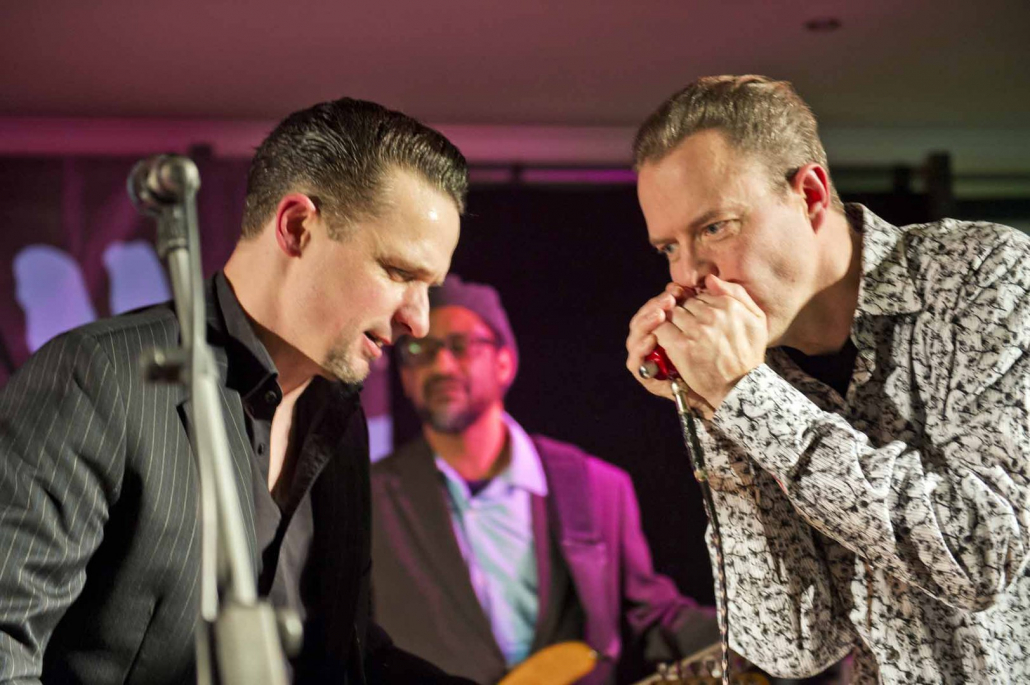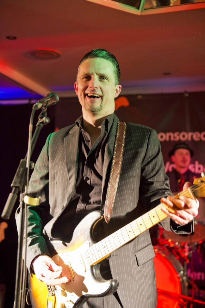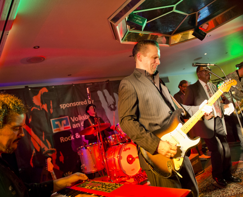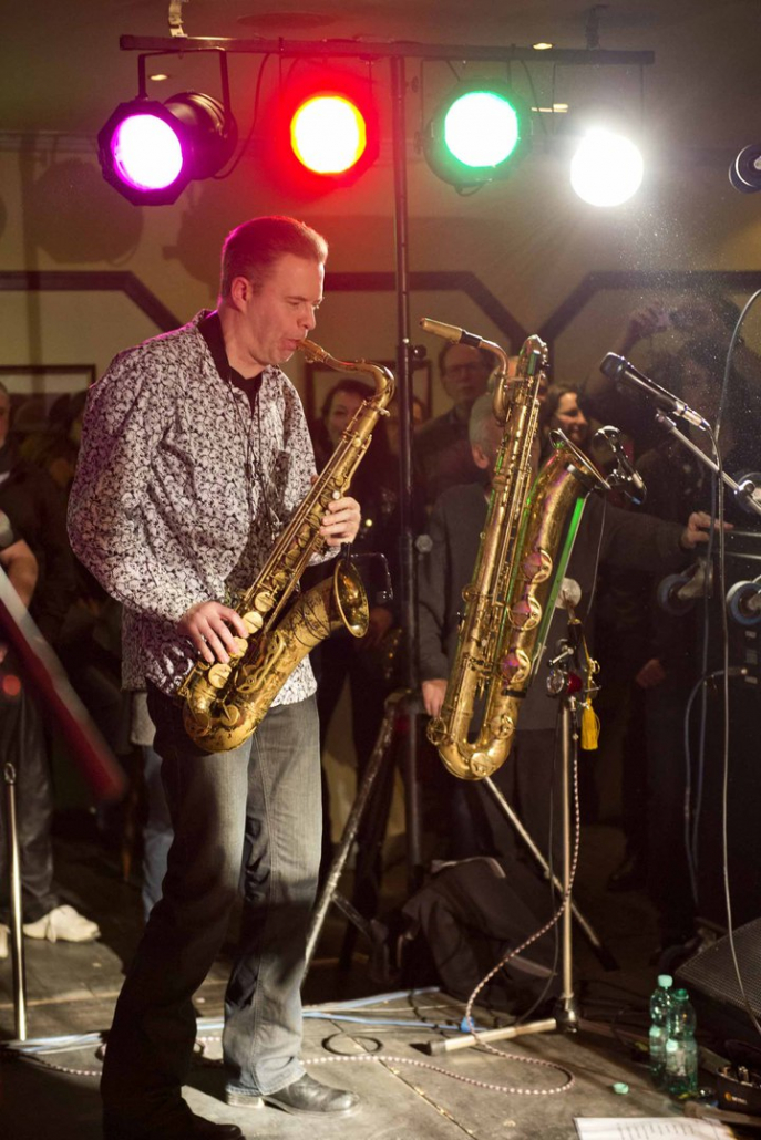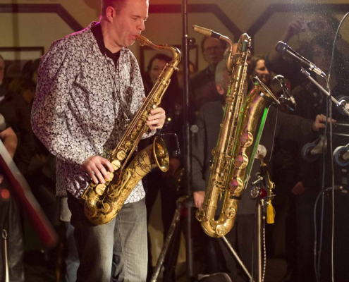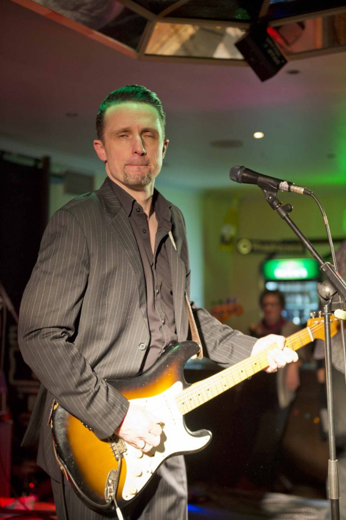 Nicht nur Kai Strauss an der Fender-Gitarre beeindruckte das wiederum sehr zahlreich erschienene Publikum im Muddy Waters Saal mit seiner authentischen Interpretation des Chicago – Blues, sondern auch seine vier bzw. fünf Mitstreiter. In den Phasen ohne Tommie Harris übernahm Kai Strauss auch die Gesangsparts, wenn Tommie Harris auf der Bühne war und sang, beschränkte er sich auf sein virtuoses Blues – Gitarrenspiel. Nicht minder virtuos erwies sich sein kongenialer Mitstreiter Thomas Feldmann, der gleich 3 Blasinstrumente genial bediente : Tenorsaxofon, Baritonsaxofon und Mundharmonika. Mit beeindruckenden Soli überzeugte auch Mo Fuhrhop das Gelderner Bluespublikum, der aus seiner “Nord Electro” nicht nur Hammond-, sondern auch Wurlitzer- und e-piano Sounds hervor zauberte.