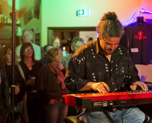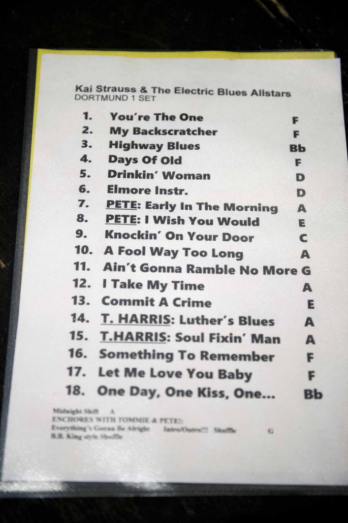 In seinem Gelderner Konzert präsentierte Kai Strauss mit seiner Band hauptsächlich eigene Stücke von seinen beiden letzten CDs, wobei er hier und da auch auf Coverversionen seiner musikalischen Vorbilder Jimmy Rogers und Luther Allison zurückgriff. In seinem ersten Set, das eine ungewöhnliche Länge von über 80 Minuten aufwies, stellte er beispielsweise seine Version von Jimmy Rogers‘ “ You’re the One” aus den 50er Jahren vor. Dieser Song ist insofern bemerkenswert, weil er aus der Zeit stammt, als Jimmy Rogers den gerade in Chicago angekommenen Blues – Newcomer Muddy Waters in seine Band aufnahm. Er stellt die erste Kooperation der beiden Großmeister des Blues dar. Die Veranstalter vom Culturkreis Gelderland sahen in der Auswahl dieses Songs eine Reverenz von Seiten der Band  an den Namensgeber unseres Veranstaltungssaals. Die Schlussphase von Set 1 wurde durch den Gastauftritt von Tommie Harris dominiert, der drei Stücke aus seiner Zeit bei der Luther Allison Band vortrug: “Help Me” / “Luther’s Blues” / “Soul Fixing Man” .