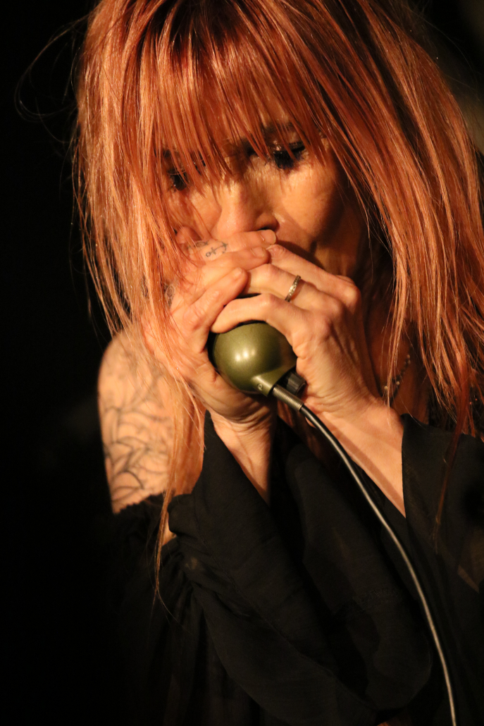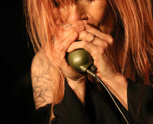 Auch die 2. Hälfte ihrer Performance bot den aus der 1. Hälfte gewonnenen Mix von Eigenkompositionen und eingestreuten Covern. Bei „Dynamite and Gasoline“ kam vorüber gehend der scherzhafte Eindruck auf, dass der Titel auf den Namen der Auftrittsbühne abgestimmt worden wäre, gleichzeitig stellte Véronique gerade in diesem Stück ihre extreme stimmliche Bandbreite von flüsternd-besinnlich bis schreiend-ekstatisch unter Beweis. Die zwei Coverversionen aus dem 2. Konzertteil bezogen sich auf zwei so unterschiedlich gelagerte Stücke wie eine Version des Depeche Mode – Hits „Personal Jesus“ einerseits und des James Brown Soul Klassikers „It’s A Men’s World“ andererseis. Der Wiedererkennungsfaktor im Publikum war extrem hoch, und kaum jemand im Publikum hatte diesen James Brown Welthit jemals von einer Frau gesungen gehört. Nicht nur an dieser Stelle konnte man merken, wie sehr Véronique das Gelderner Publikum faszinieren konnte. Bei „Ain’t No Place“ gab es dann Passagen, bei denen das Publikum mitsingen konnte, gleichzeitig diente dieses Stück zur „présentation des musiciens“. Außerdem benutzte Véronique diesen Song, um ihre Fähigkeiten an der „blues harp“ zu demonstrieren.